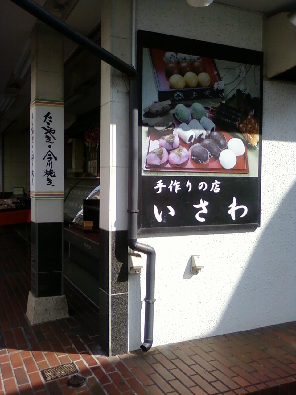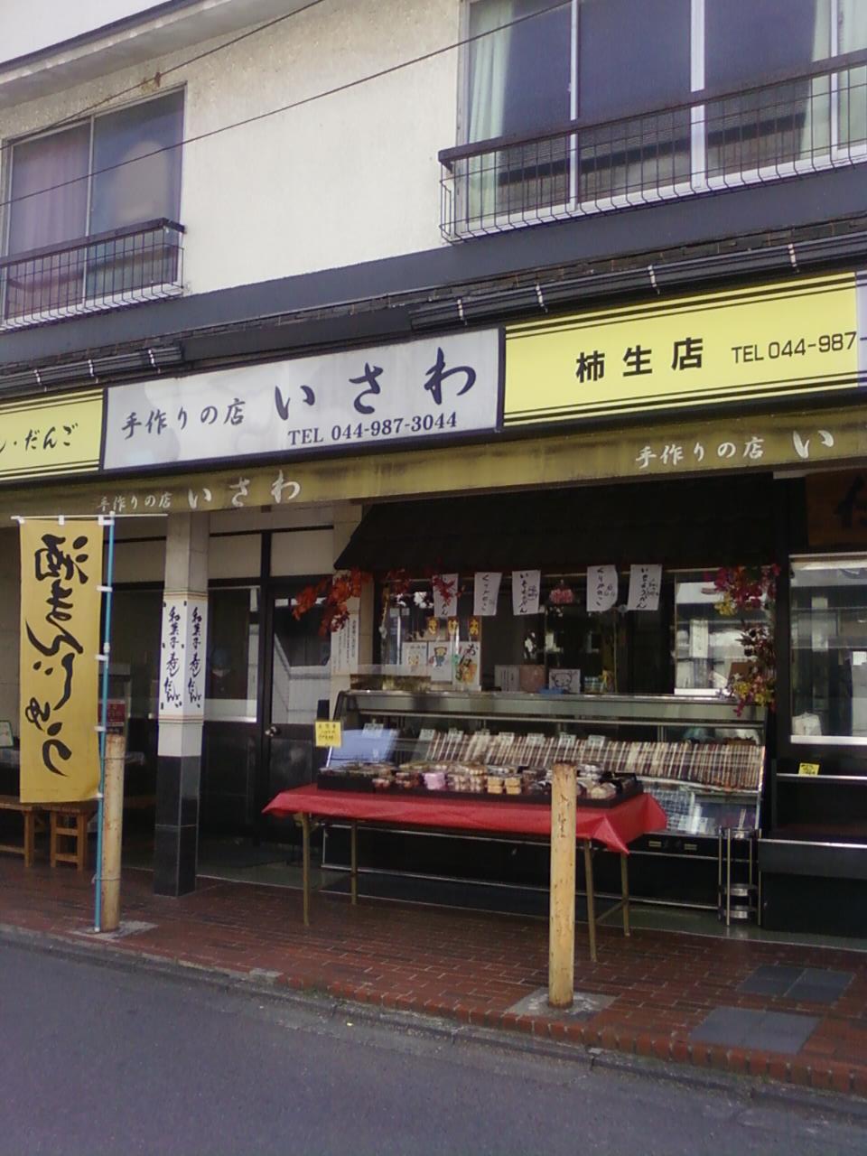 ここのいさわさんは、小田急線柿生駅南口から一分半くらい、改札を出て目の前のロータリー右手奥から始まる柿生商店街の入り口に近いところにあります。かなり間口が広くて、和菓子、おだんご、おむすび、お惣菜、たこやきまで売っています。和菓子屋さんというよりお弁当屋さんに近い部分もありますね。ここの105円パックのお惣菜は種類が多くて助かっています。