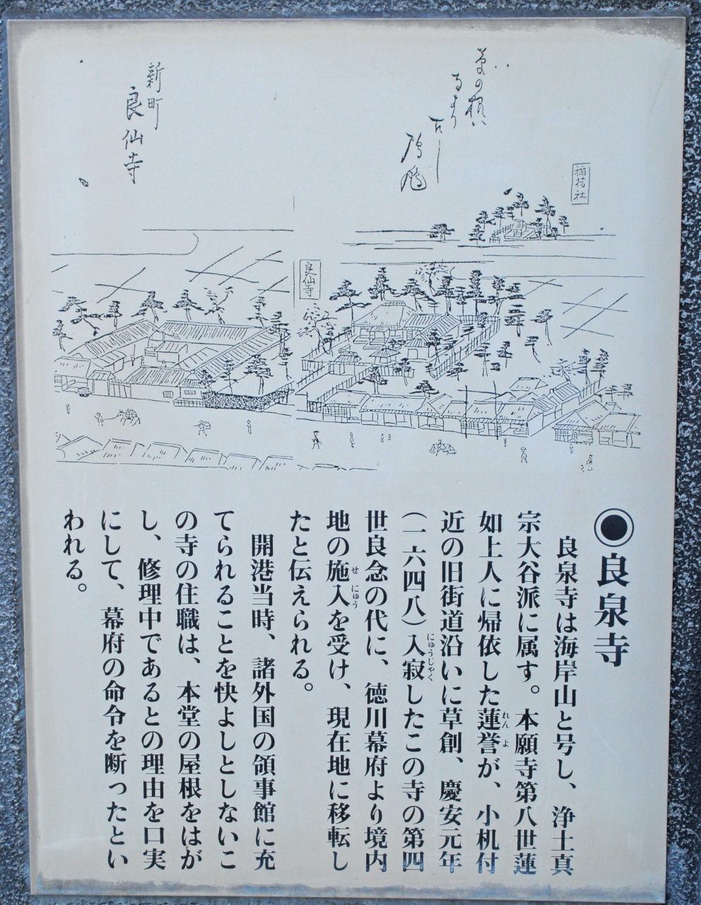京浜急行の神奈川新町駅から、第一京浜沿いに3,4分南へ行くと門前に出ます。横浜開港時に、外国の領事館が置かれようとしたときには、屋根を壊して修理中と称して、幕府の命令を断ったという逸話があります。ここには、明治期の実業家であり、「糸屋の平八」「天下の糸平」などと呼ばれた田中平八のお墓が一番奥にあります。