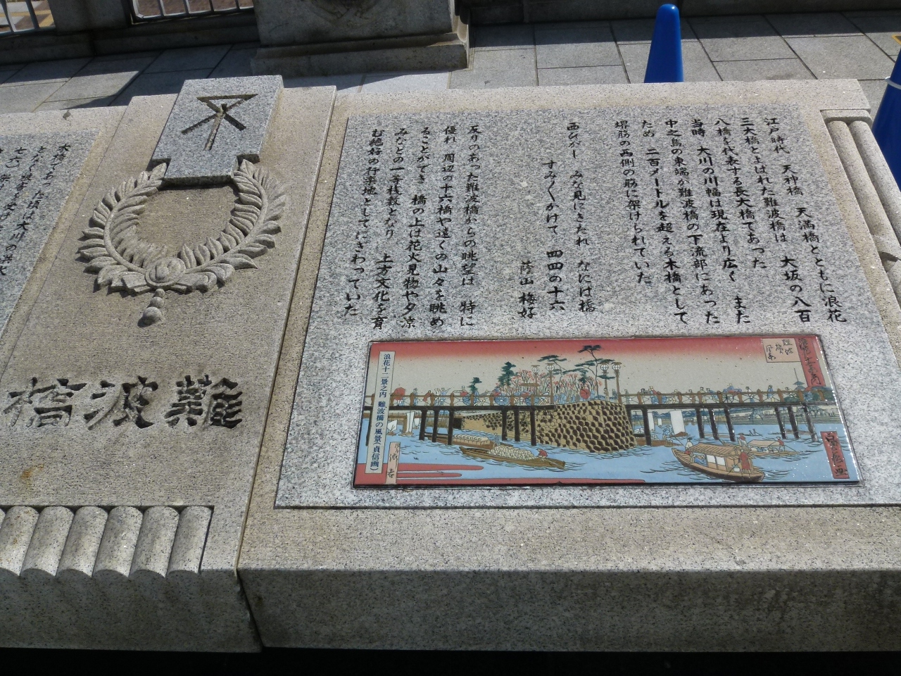この「難波橋」は江戸時代に「天神橋」「天満橋」とともに「浪花三大橋」と呼ばれたようです。今は、「日本夜景遺産」の三大橋と呼ばれています。夜景が綺麗でしょうね。見てみたいです。この橋のふもとに、難波橋の記念碑がありました。江戸時代の姿をみるとジーーーンと来ました。