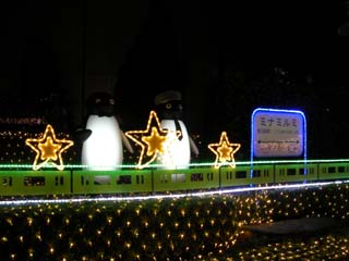 新南口からサザンテラスに行ってみるとイルミネーションが始まっています。今年もスイカのペンギンがいてミナミルミの駅名標がありました。今年も看板がなく節電のためか以前よりイルミネーションが減っている感じです。