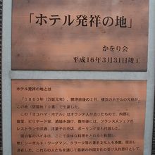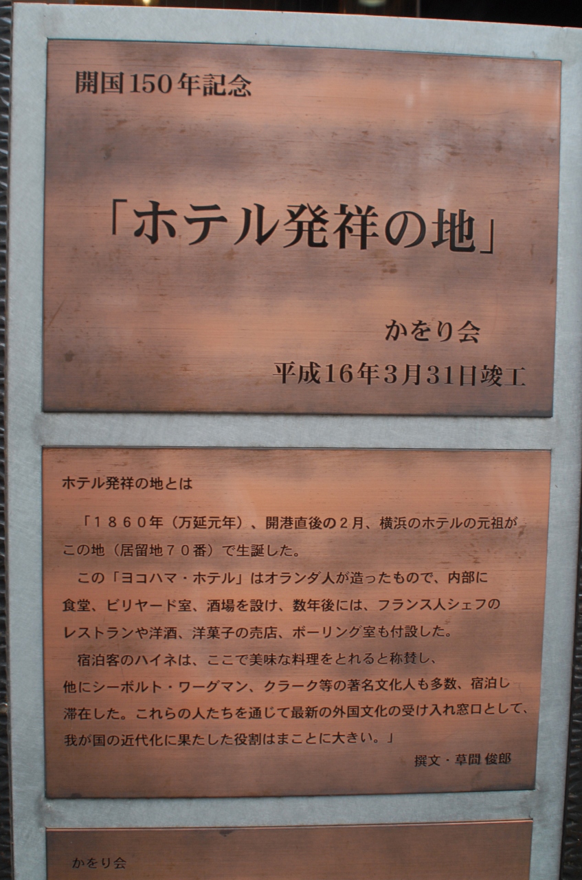 1860年にオランダ人の船長フフナーゲルが開業した横浜で最初のホテル「ヨコハマ・ホテル」が、現在フレンチレストランを営業しているかをりの場所にあったそうです。このホテルには、最初、食堂、ビリヤード室、バーが設けられ、その後、フランス人シェフによるレストランや洋酒、洋菓子の販売、ボーリング室なども設けられたようです。建物はそれほど立派ではなかったが、シーボルト親子も滞在したといわれています。