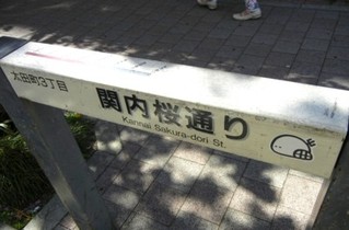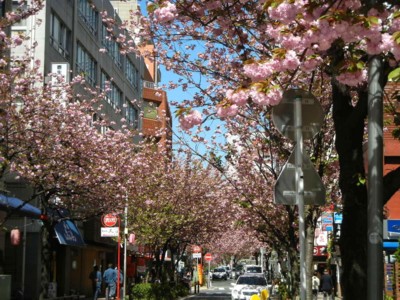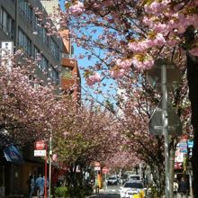 道路幅はそれほど広くない道路の街路樹が八重桜で