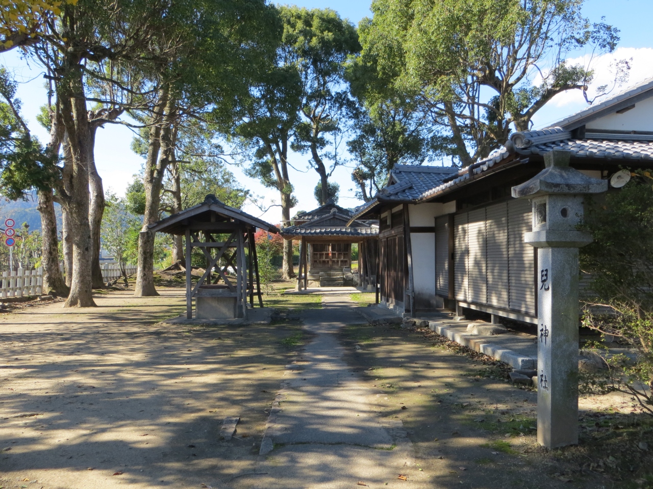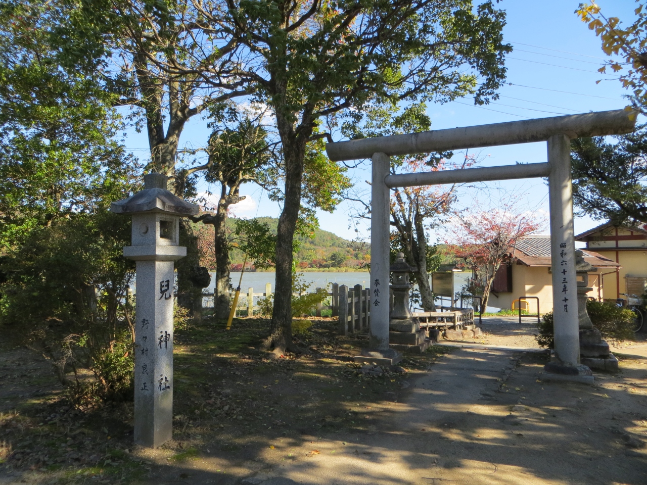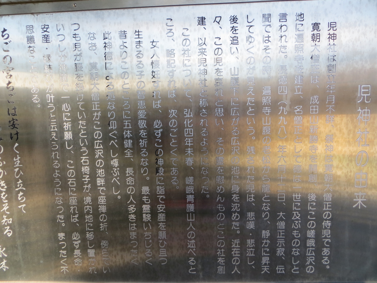 広沢池の西畔に小さなお社があります。児神社(ちごじんじゃ)と読みます。平安時代にこのあたりあった遍照寺(真言宗)を建立した寛朝を祀っているとのこと。寛朝が亡くなった後、遺された侍児が悲観して広沢池に身を沈めたという言い伝えがあります。境内に石椅子があってそこに座ると長命、安産、縁結びの願いが叶うとのこと。境内は静かで情緒があります。