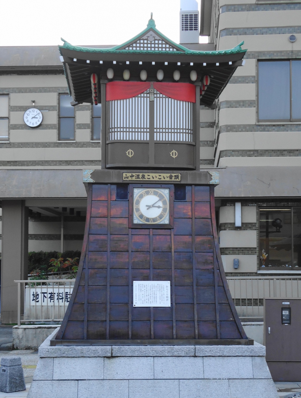 山中温泉の総湯、山中座の前の広場の隅にからくり時計があります。