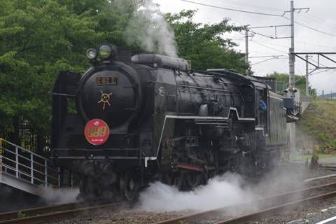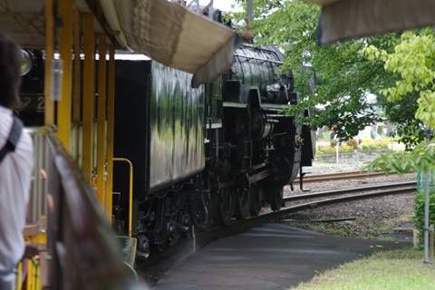 水蒸気や煙を吐きつつ木陰に消えて行くC62の2号機を見送る。短い時間で乗るのと撮るのを両方楽しめるのは、特徴的かも知れない。