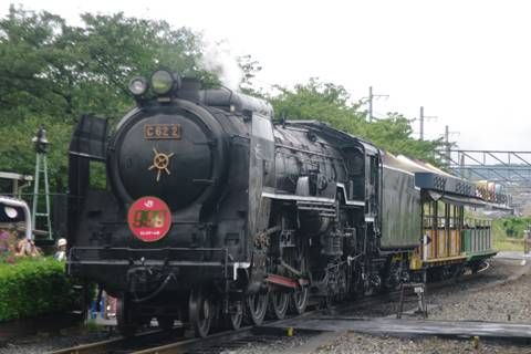 さて乗車。C622が従えるのはオープンエアの客車。大阪で行われた花博の際に使われた車両だそうだ。残念ながら雨がちの天気ではあるが、席が一通り埋まる程度にはお客さんがいる。中には外国人の家族連れなんてグループまでいた。