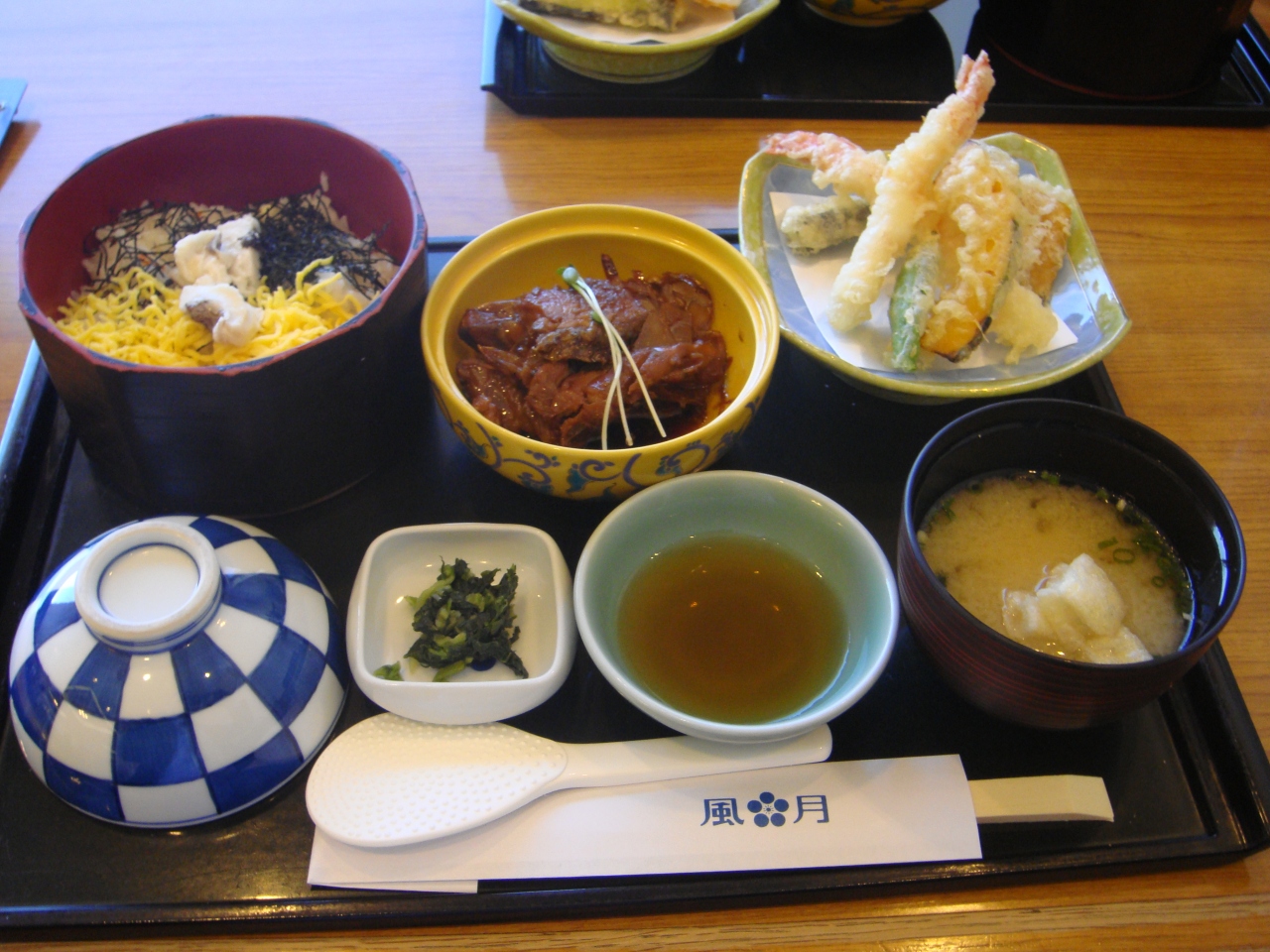 福岡出張時に空港3階にある「風月」で昼食をいただきました。店員さんに窓際の席を案内ていただきましたので、飛行機の離発着が窓からよく眺めることができました。メニューは九州名産の料理が多く、中でも鯛料理が豊富でしたので「鯛飯と刺身の定食」をいただきましたが、あまりインパクトはなく、普通の味でした。値段も空港価格の1500円で割高です。