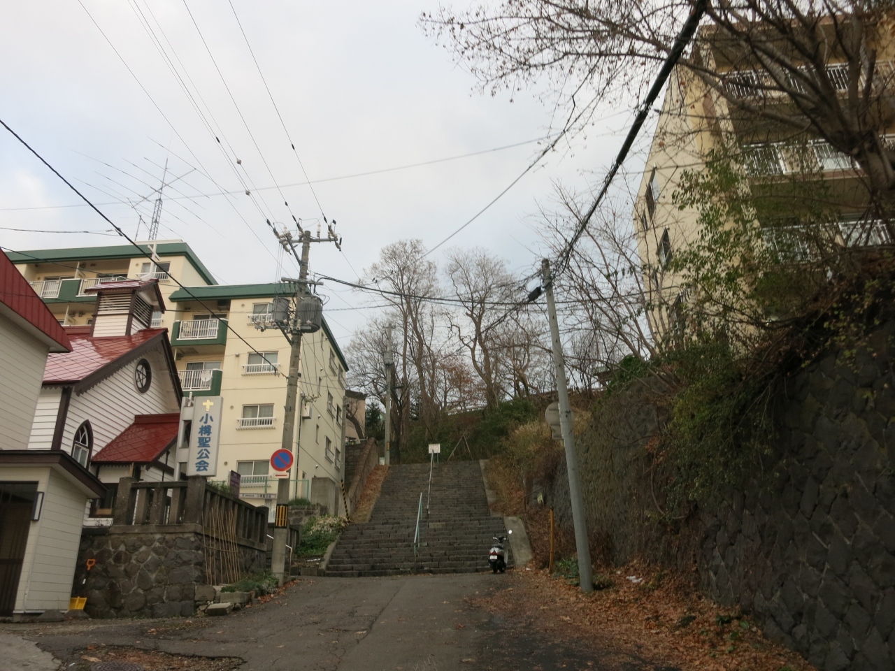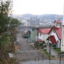 南側から来ると、この教会の先に階段がありますが、あと50mほどで水天宮があります。小樽の街と小樽港が見渡せます。特に夜景がきれいなので併せて行ってみるとよいと思います。ただ、水天宮は街灯も少なく暗いので注意が必要です。