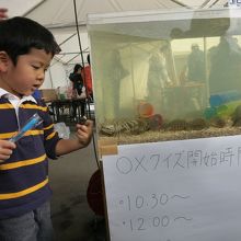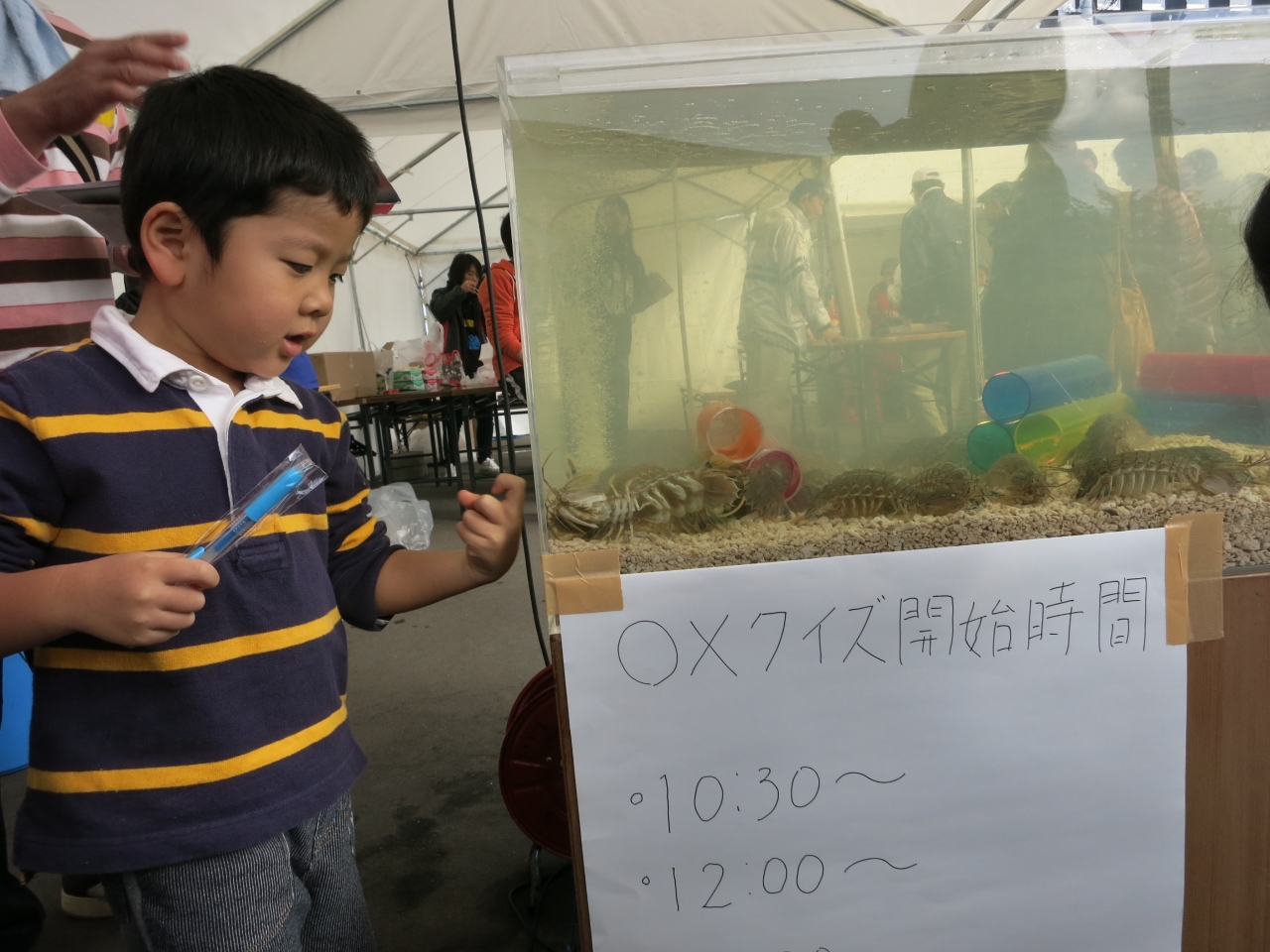 そこで、次は茹でシャコ(\500/3尾)を食べる事にしました。塩茹でにしたその味はなかなかの逸品。特設テントの椅子で、用意してある料理はさみを使って、切れ込みを入れ、殻を外して食べました。会場入口などで配っているチラシに、切れ込みの入れ方が書いてありました。なお、慣れてくると、味に気を取られ、見た目はあまり気にならなくなりました。