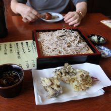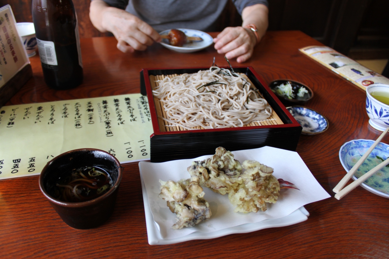 天ぷらとざるそば、五平餅、そしてビールが本日の昼食。そばは美味しいがソバつゆの味が少々薄く物足りなかった。五平餅はとても美味しかった。