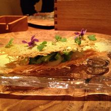 ソムリエの方が気さくな方で色んなお話をさせていただきました。グラスのシャンパンと国産のお水を注文してからコースが始まります。お皿などの器も美しいし、盛り付けも彩りもカラフルで前菜からもう目を奪われます。もちろんとても美味しいです。気泡がたくさん入った栗のパンはスポンジみたいなふわっふわのパンをそのまま頬張ります。面白い!スープ、魚、鳩のお肉、カニのパスタなどがあり、デザートも3種類ほど出てきました。小さ目の箱を持ってきて「開けてみてください」と言われたので開けてみるとふわっと煙が出てきてビックリ。玉手箱の中には大きな焼き栗が入っていました。はぁ~素敵な時間を過ごせました。