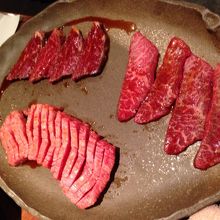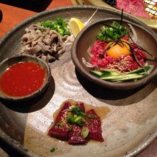 サラダ、レバ刺し、ユッケ、店長のおまかせのお肉、ホルモン、チヂミなどを注文。サラダは少し甘めのドレッシングで、量は4人で食べるには足りない感じ。何とレバ刺し、センマイ刺し、ユッケが頂けました!認定か何かをもらっているとのこと。お肉は店員さんに説明して頂きましたがどれがどのお肉か覚えられず…。でもどれも刺しがいっぱい入った極上のお肉でした。ホルモンは塩かタレかを選べます。