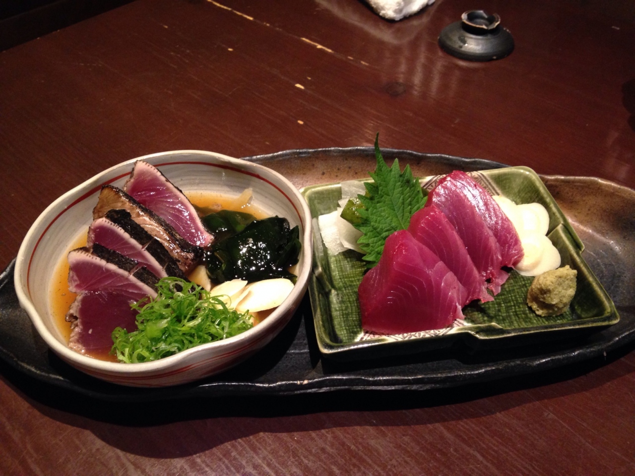 小さ目の個室に案内してもらいました。早速オーダー。名刺にも泳ぎイカと鰹の藁焼きタタキと謳われているように名物はコレなので忘れずオーダー。塩かポンズが選べます。店員さんが「今日はカツオの脂があまり乗っていないので塩はおススメしません」とのこと。何だー、ガックリ。でも頼みます。かなり分厚い鰹でした。結局お代わりしてしまいました。