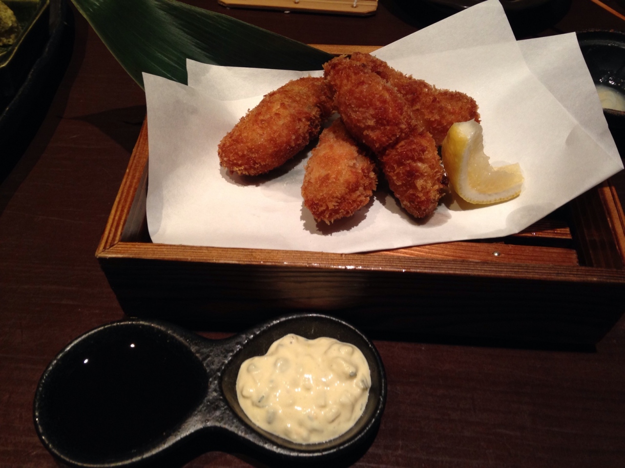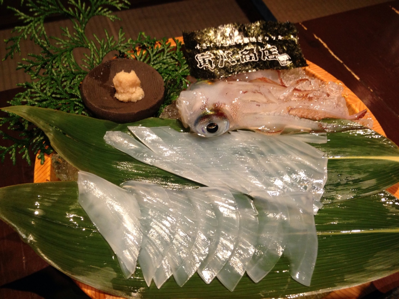 イカの刺身は一番小さいのを注文、100gで2000円とか書いてあったと思います。カキフライ、白子の天ぷら、ブリとミル貝の刺身、サザエのつぼ焼きを頼んで16000円。た、高い。美味しかったけど~。