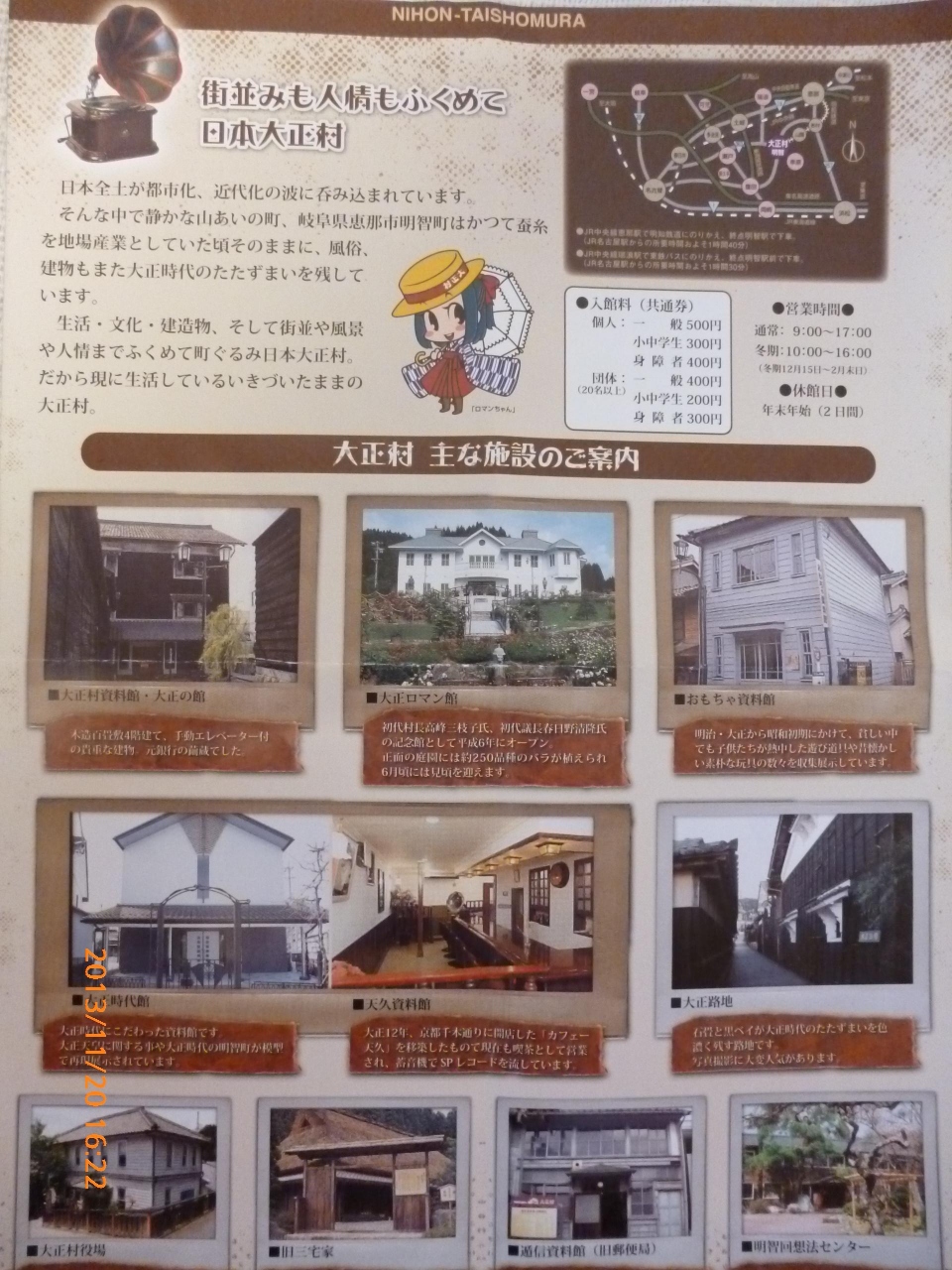 大正村は明治村や昭和村とは異なり、明智町の一部が地域全体として、観光事業に取り組んでいます。 囲われた地域ではないので、入村料等もありませんでした。 一部施設には入館料が必要ですが、4ヶ所の施設に入れるフリーキップは、500円とお手頃です。