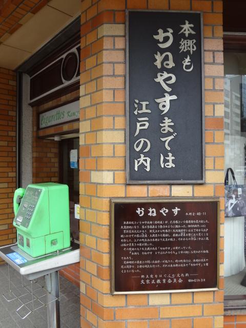 本郷三丁目の交差点のところに、かねやすというお店があります。そのビルの側面に「本郷もかねやすまでは江戸のうち」という川柳が書かれています。江戸時代、歯医者のかねやすさんが歯磨き粉を売り始めたのが、この店の始まりだそうです。江戸もこの店あたりまでは賑やかでしたが、ここを外れると武家屋敷や寺が多くなり、寂しい雰囲気になることからこの川柳が詠まれたようです。