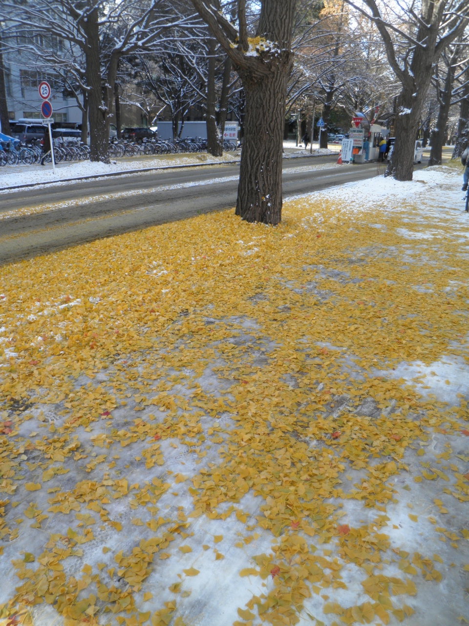 札幌の北海道大学の13条門から入って、キャンパスを散策しました。 11月なので、銀杏並木の色づいた黄色い葉が落ちて、歩道に積もっていました。 イチョウの枝には、銀杏がたくさんついていました。 でも、ここの銀杏は小さめなようでした。