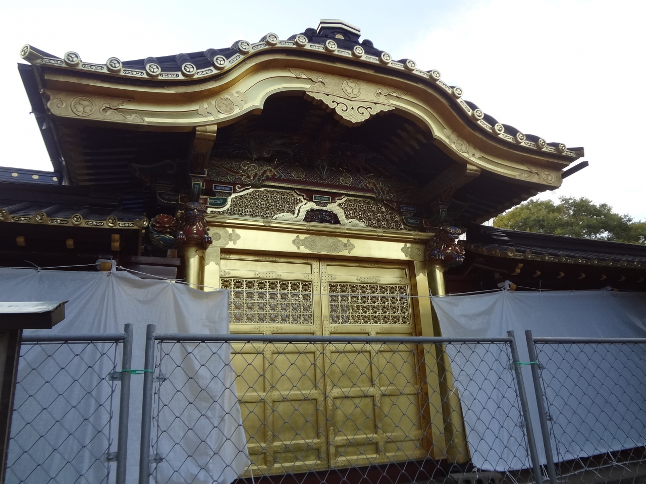 慶安4年(1651)につくられた唐破風造りの四脚門で、日本に一つしかない金箔の唐門です。門の左右上部にはとても精巧なつくりの松竹梅と錦鶏鳥の透彫、門柱には左甚五郎作の昇り龍・降り龍の高彫があるそうですが、ちょうど訪問した時には工事中でシートをかぶっていて、この龍の彫刻を見ることはできませんでした。ただ、金の門はとても鮮やかで美しいものでした。