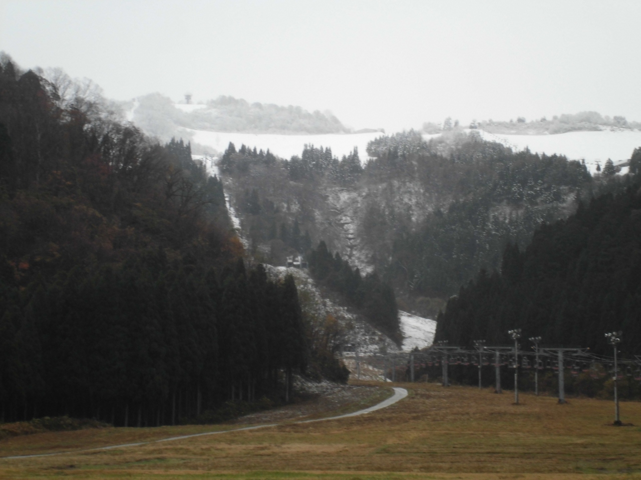 ゲレンデにリフトはセットされて、ゲレンデの上部はだいぶ雪が降ったようで、白くなっていましたが、下部ではまだゲレンデに雪は全くありませんでした。