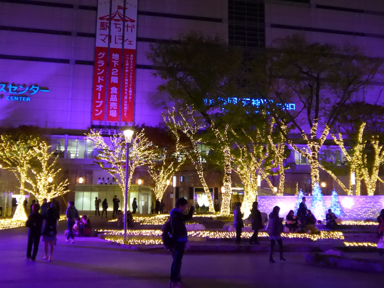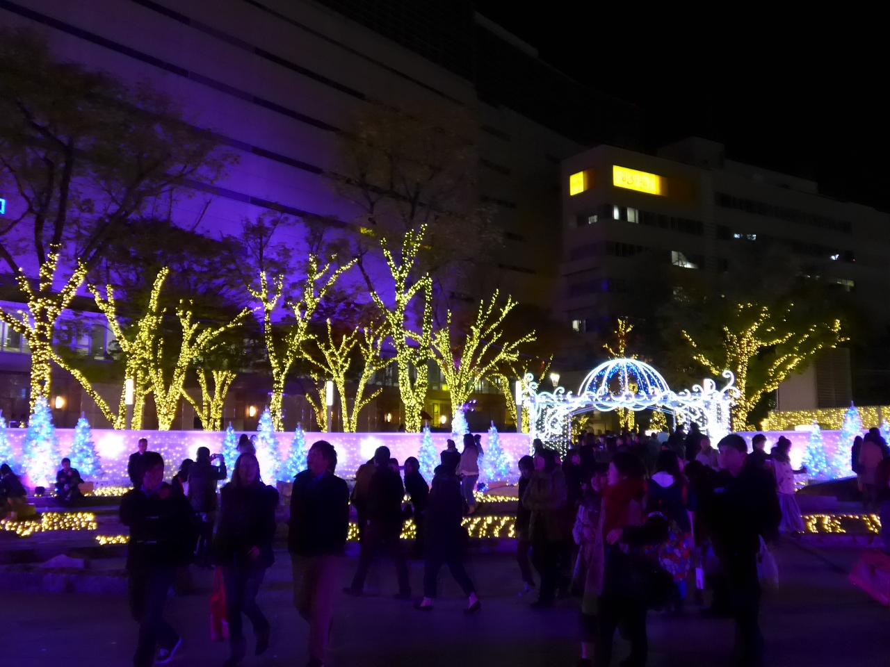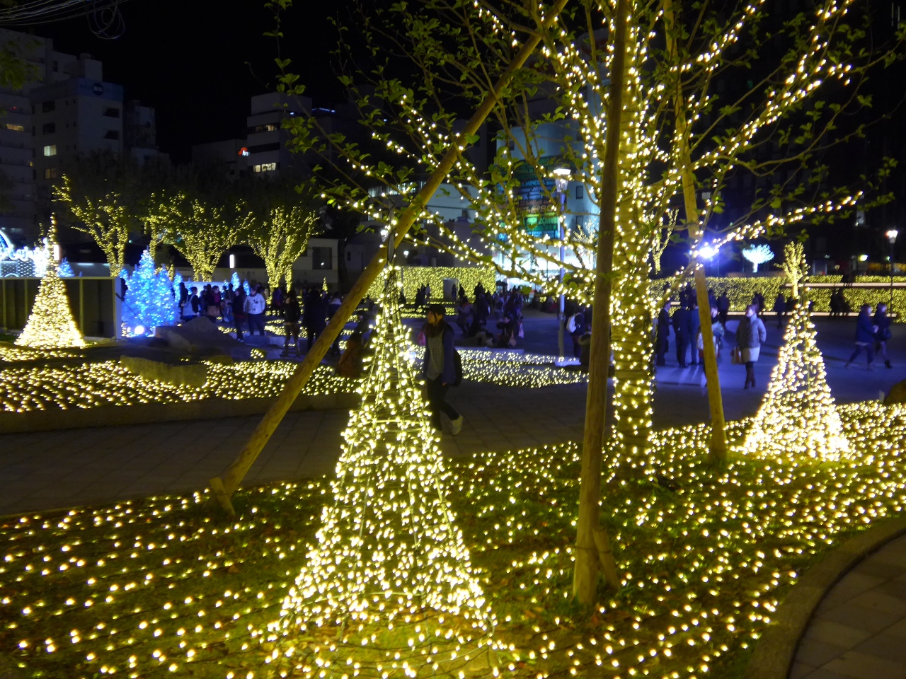 西鉄天神駅前にある警固公園の2013年、冬の風物詩「イルミネーション」は公園内、全てをLEDランプ色とりどりで飾られとても見応えがあります。この公園を中心に新天町商店街方面へ行く通りも多くのイルミネーションやクリスマスツリーが飾られ待ちゆく人の目を楽しませます。