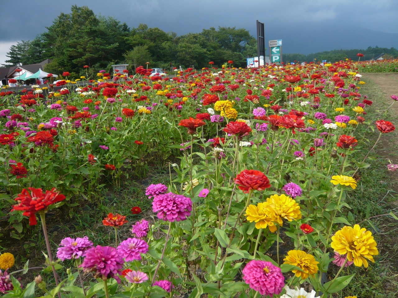 駐車場へ着くと、目の前にはあたり一面に花が咲いています。私たちが行った時には、百日草が満開でした。