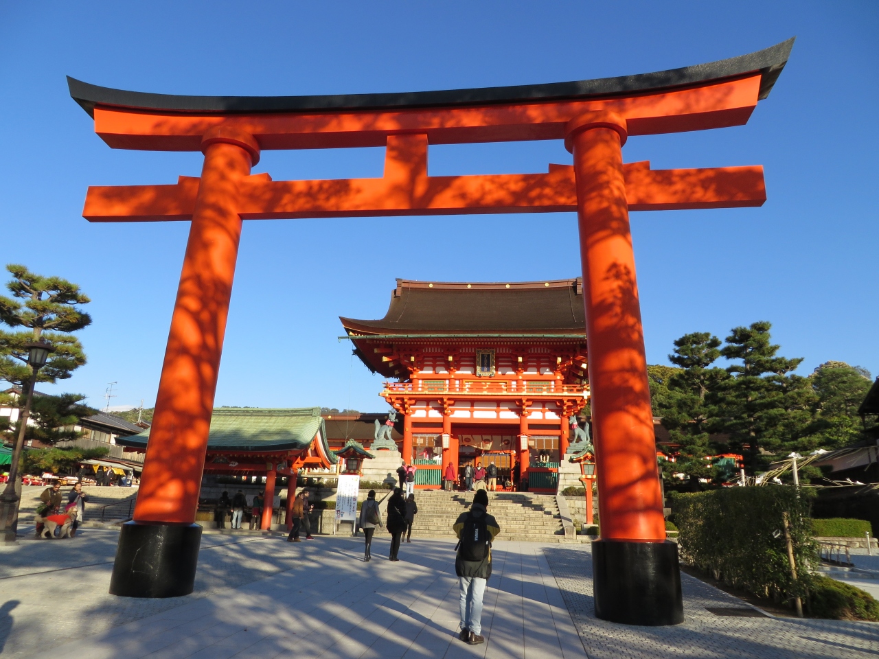 JRの稲荷駅を降りた瞬間、目の前が鳥居で、その先に赤色が鮮やかな本殿が目に飛び込んできます。