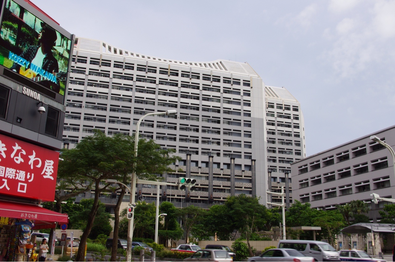 国際通り商店街の入り口付近にある大きな建物が県庁です。