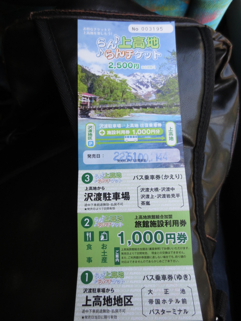 通常往復2,000円ですが、これは上高地内で使える1,000円の金券が付いて2,500円。