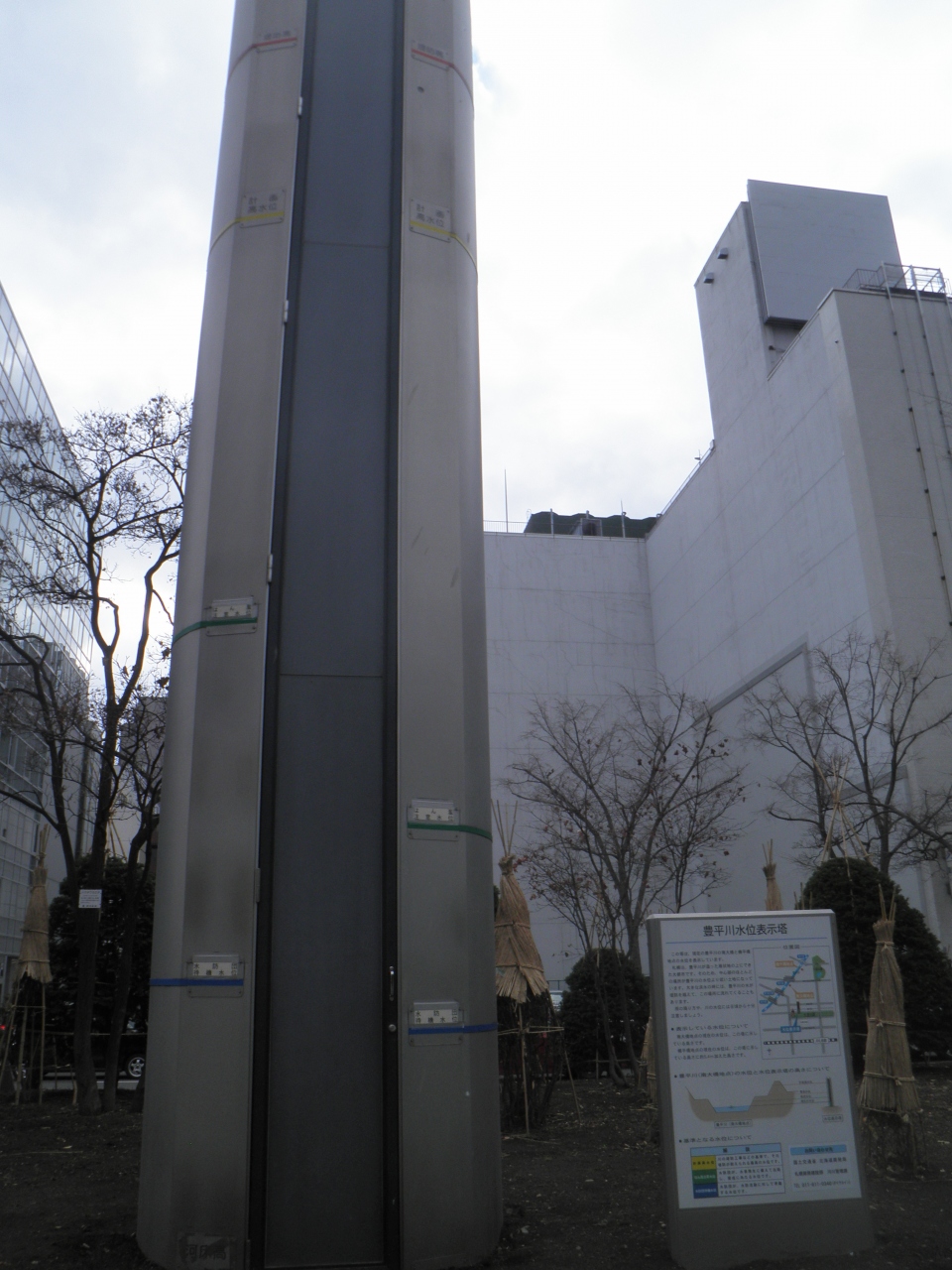 さっぽろテレビ塔の近くにある豊平川水位表示塔を久しぶりに観に行きました。 でも、やはり装置の表示は消えていました。 近くでは、鳩にエサをあげる人がいてたくさんの鳩が集まってこわいくらいでした。 また、ホワイトイルミネーションの雪だるまと発電装置が置かれていました。