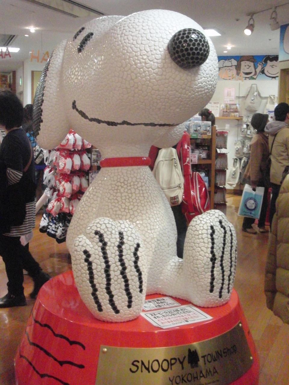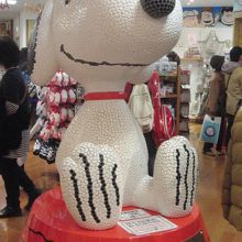 ショーウインドーには、クリスマスツリーが飾られていて、スヌーピーのキャラクター達がサンタクロースの某氏をかぶっていました。