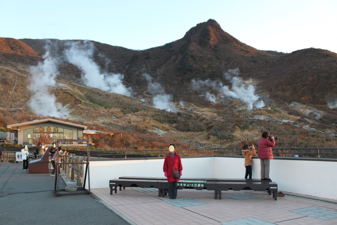 噴煙が上がり、硫黄の匂いが立ちこめて、かつては地獄谷と呼ばれていた事もうなずける。ここでは硫黄泉で茹でた黒い温泉卵が有名。この卵を食べれば寿命が延びる?そう。