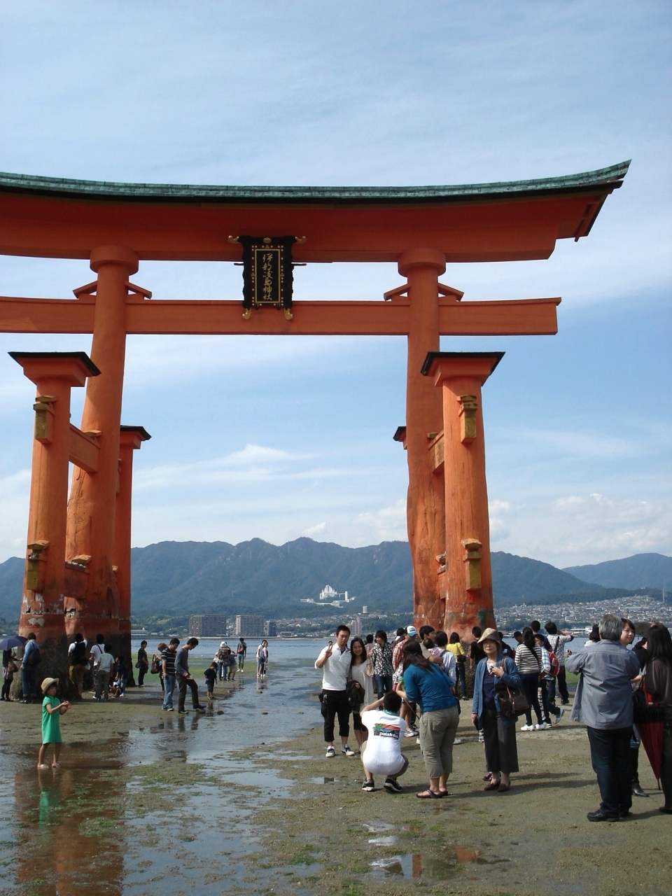 厳島神社はユネスコの世界遺産に登録されている。ここの朱塗りの鳥居は島に渡る途中からながめられ、宮島に来た気分を盛り上げてくれる。海の満ち引きによって海水の中に立っているようになったり、潮の引いているときは歩いてそばまで行くことができる。