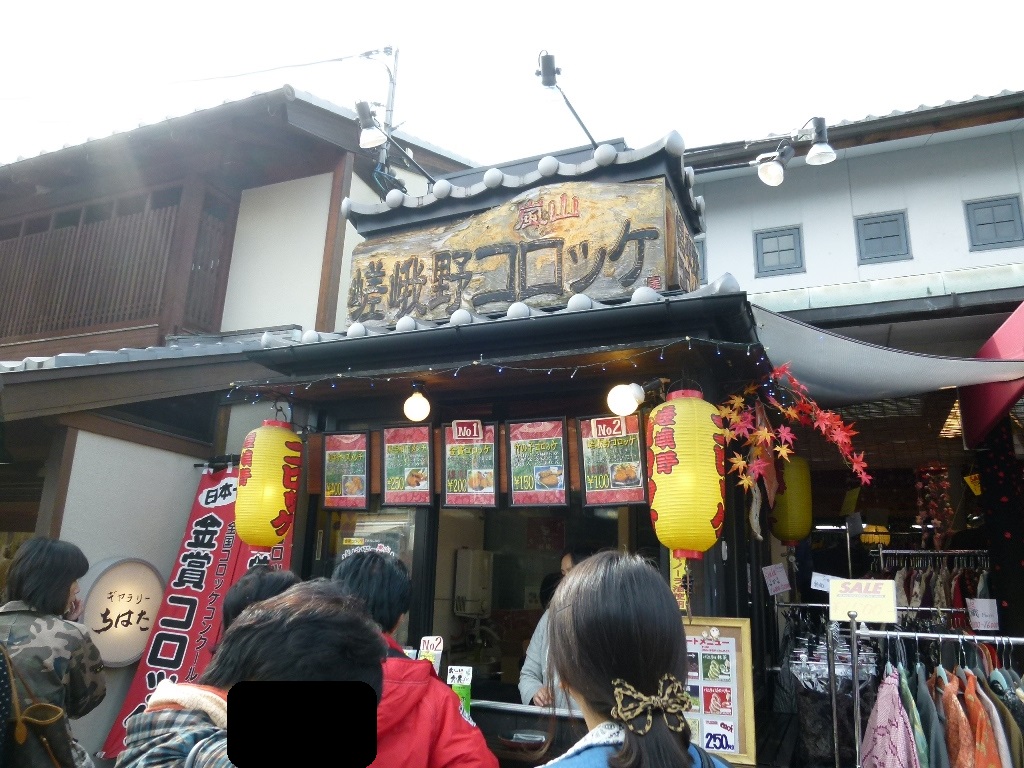 京福嵐山本線・嵐山駅下車して渡月橋へ向かう道路沿いにあります。話題のコロッケ店ですが、全国コロッケコンクール金賞受賞。すごい人気があって並んでいました。観光マップ、雑誌などでも取り上げられてグルメファーンが集まっていますね。熱々ホクホク手作りならではの味が絶品でした。