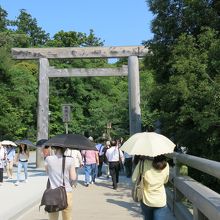 伊勢神宮内宮の境内に入るためには五十鈴川にかかる宇治橋を渡ります。総檜造りで造られた立派な橋で式年遷宮ではこの橋も架け替えられます。檜造りの橋なんてそうそう渡ることもありませんので柔らかな木の感触を確かめながら渡ってみましょう。