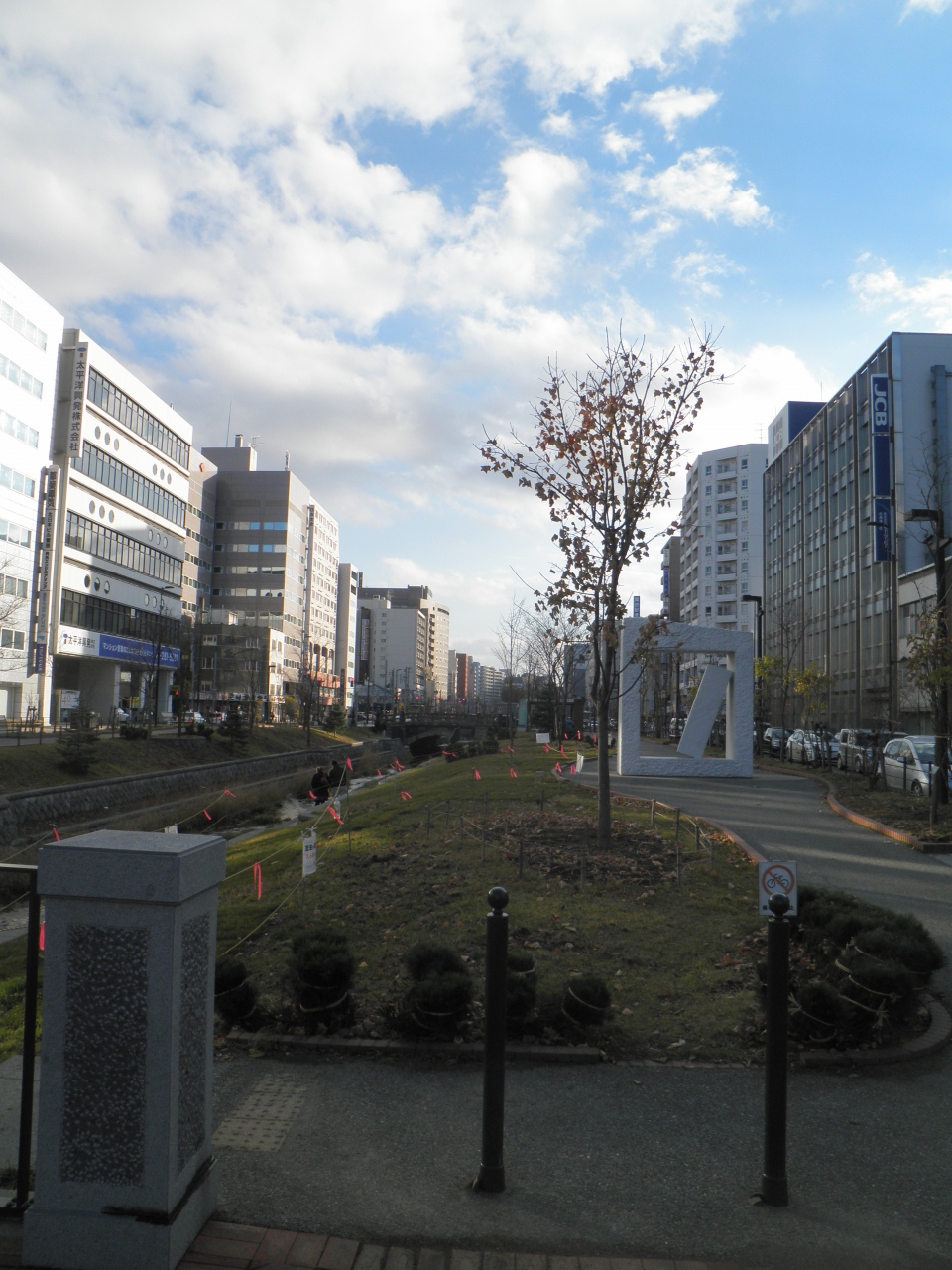 創成川公園は創成川の両岸に造られた細長い公園で、創成トンネルができたときにできた割と新しい公園です。 いくつか屋外芸術が配置されて、生棒はかなり大きな作品です。 大通公園には歴史を感じさせる作品が多いけど、ここは現代的な作品が多いです。