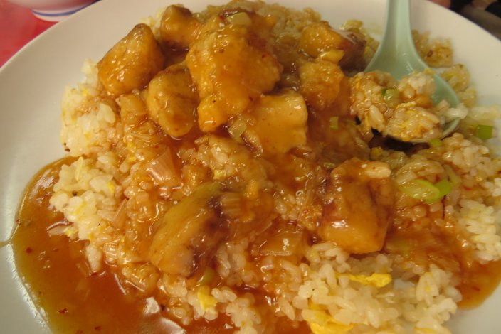金目鯛がゴロゴロはいったあんかけチャーハン。こんなにいっぺんに金目鯛を食べられるなんて、とてもコストパフォーマンスのよいお店です。