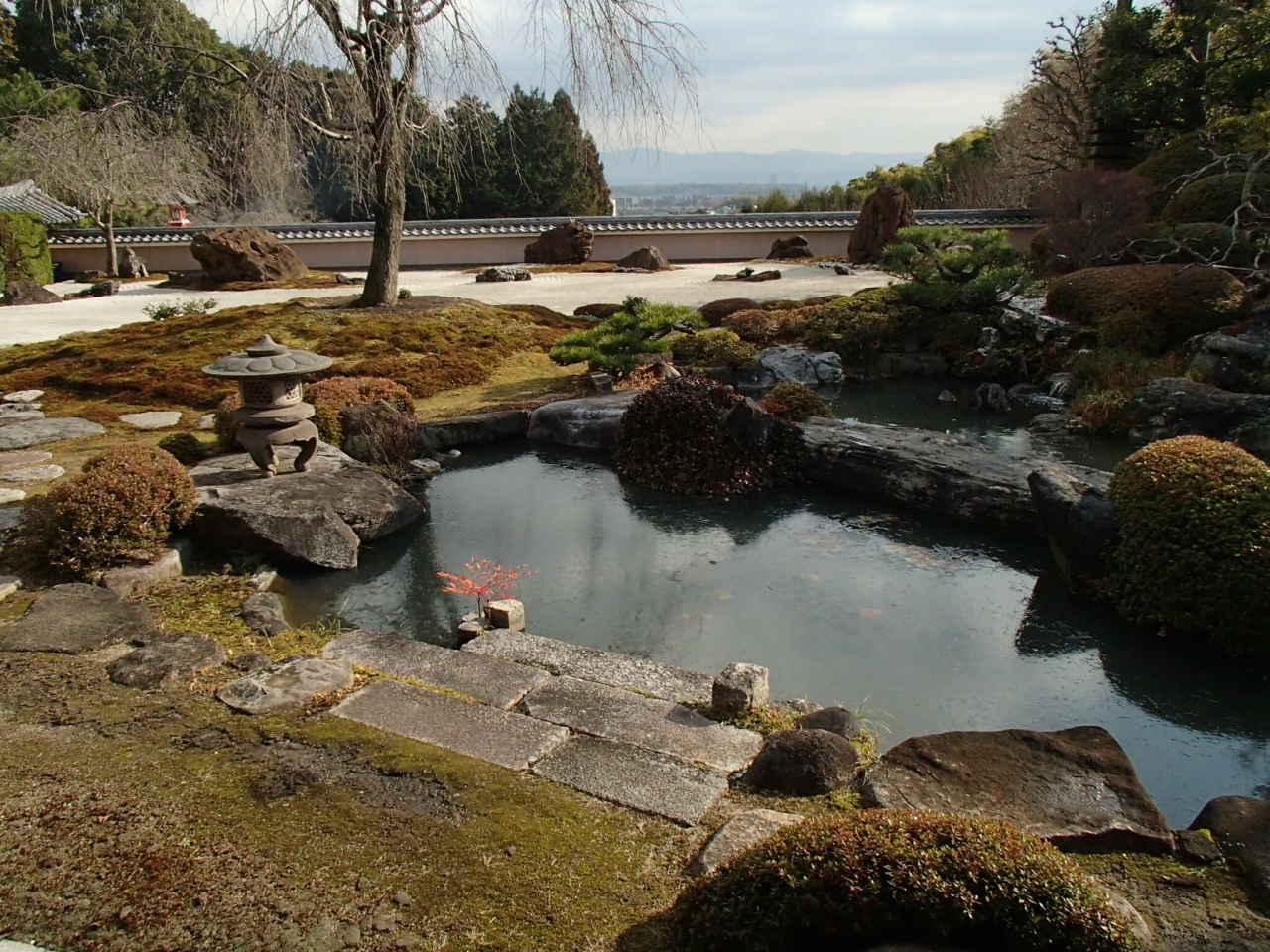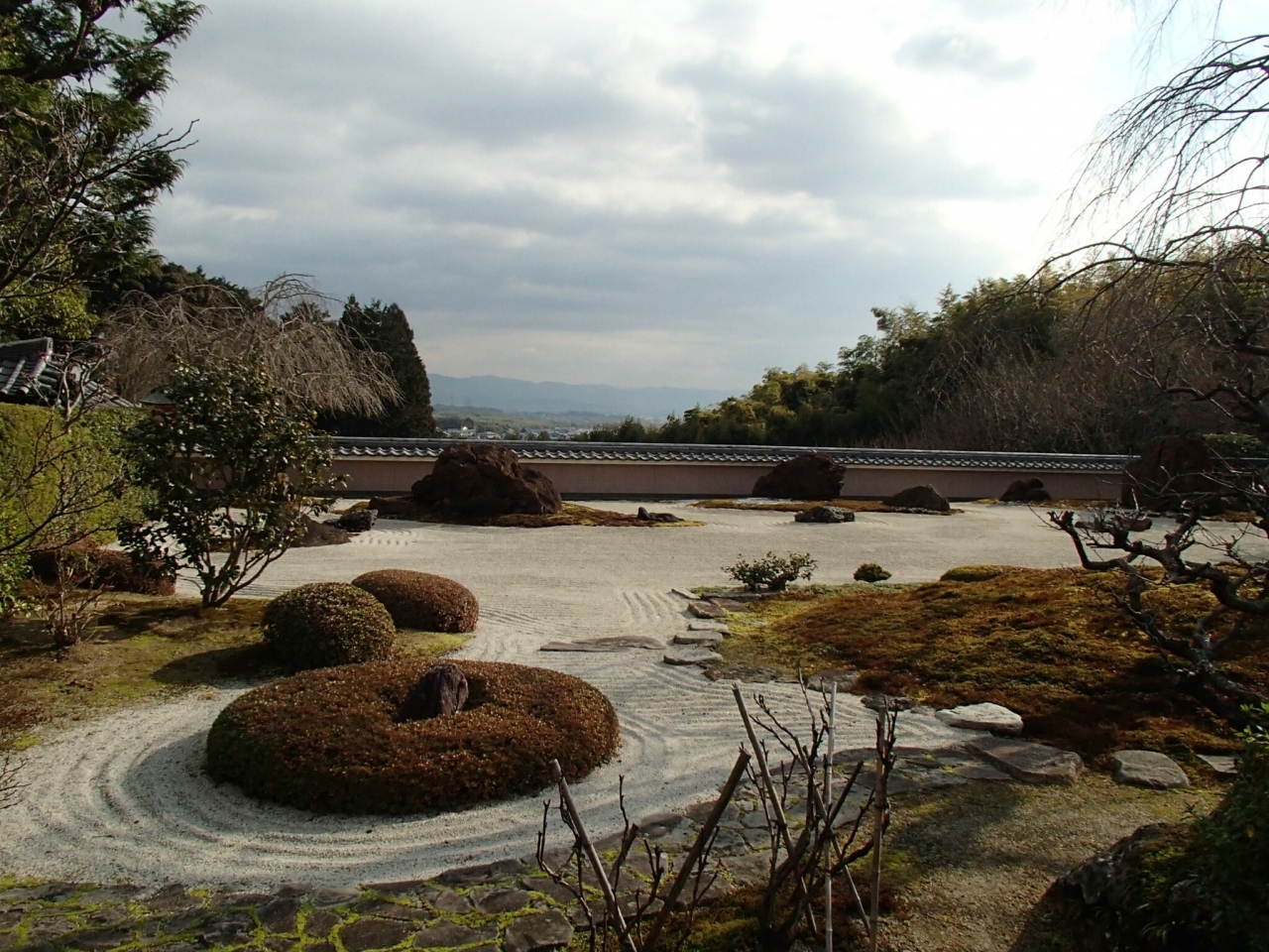 見どころは、いろいろな形をした岩を配置した庭園です。「石の寺」とも呼ばれているそうです。はるかかなたには東山が見えており、スケールの大きさが感じられます。
