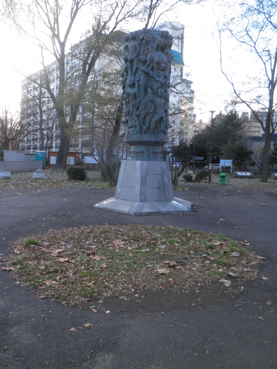 札幌のすすきのの南側にある中島公園を散策してみました。 休日だったのですが、コンサートホール・キタラでコンサートがあるらしく、多くの人々が歩いてみました。 ちょっと歩道を離れたところに、子供用の遊具があって、その中に森の歌の記念碑が建っています。 子供にはおしくらマンジュウしているように見えるみたいです。