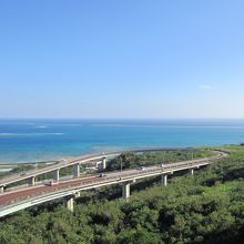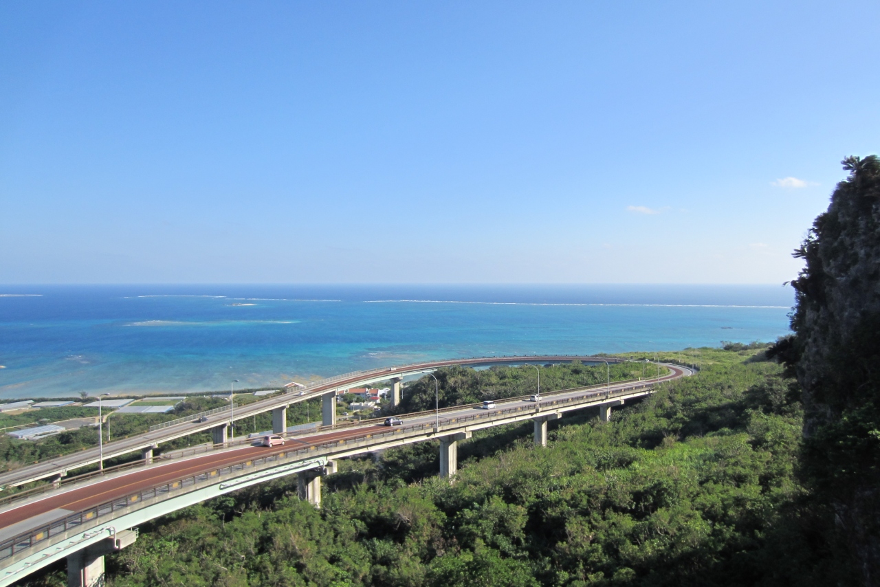 知念岬からすぐのところにある絶景の橋です。海の方からは登りになりますが、トンネルを過ぎたあたりの道端に駐車して展望ポイントに行きました。その日も何台ものクルマが停まっていて、数分歩いて行くと美しい眺めを得られます。天気もよかったので、なおさら風景が引き立ちます。