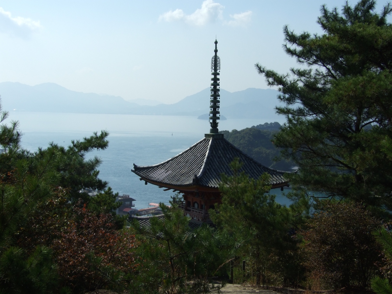 しまなみ海道生口島の絶景ポイント 小高い丘の上に立つ3重の塔と瀬戸内の海。とても風光明媚なところでとても気持ちが休まる大好きな場所のひとつ。永享4年(1432年)に当時の生口島の領主小早川信元・信昌によって建立された国宝三重塔。
