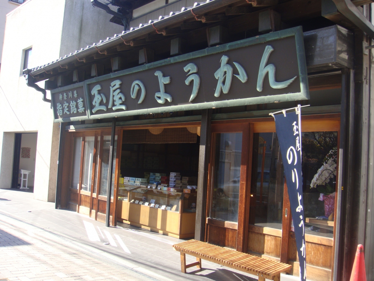 江ノ電江の島駅から商店街を歩いていると、木造のクラシックな商店がありました。この玉屋さんは創業明治45年で神奈川県指定銘菓、江ノ島で漁れた青のりを粉にしたものを白餡にねりこんだ「のり羊羹」を販売しております。江ノ島らしいお土産を感じさせます。