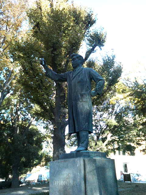 白衣姿で台座の上に立ち、実験中なのか試験管を持った姿で、研究熱心だった英世の生涯が偲ばれる姿です。
