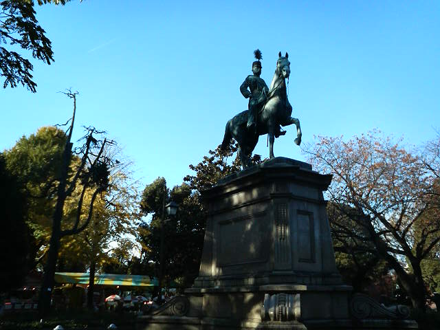 騎馬服姿で馬に跨ったポーズで台座の上に建っていて、躍動感溢れる御姿の像です。