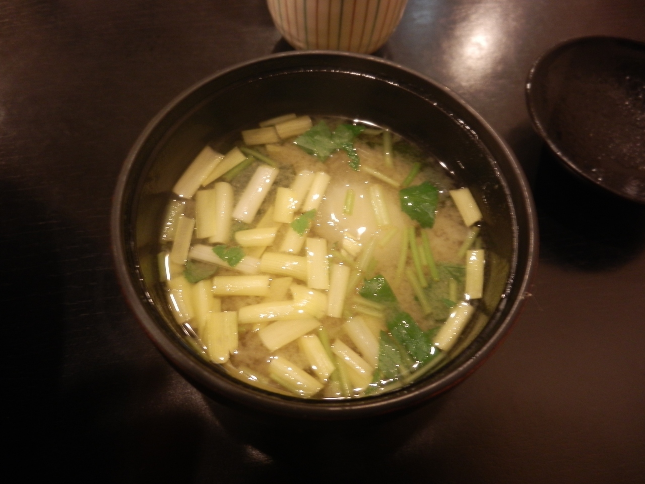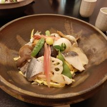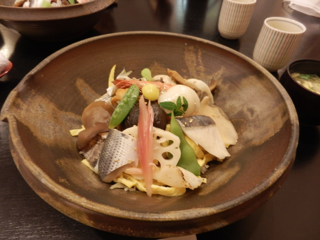 岡山に行ったらぜひ備前ばら寿司を食べてみたかった。この店は2日前から予約が必要で手がかかるためだそうだ。もともとこのばら寿司は明治の初めから太平洋戦争前まで作られていて聞きこみと文献を元に作られた。化学調味料と、食品添加物が一切入っていない。ごぼう、れんこん、サトイモのなどの根菜類は鮪のあら汁で、干瓢、高野豆腐などは昆布、鰹節、椎茸の戻し汁で煮てある。お味はというと、やさしい、いかにも体に良さそうではあるが、少し酢の味がたりない気がした。これに黄にら汁の味噌汁が付くが3000円とは高い。