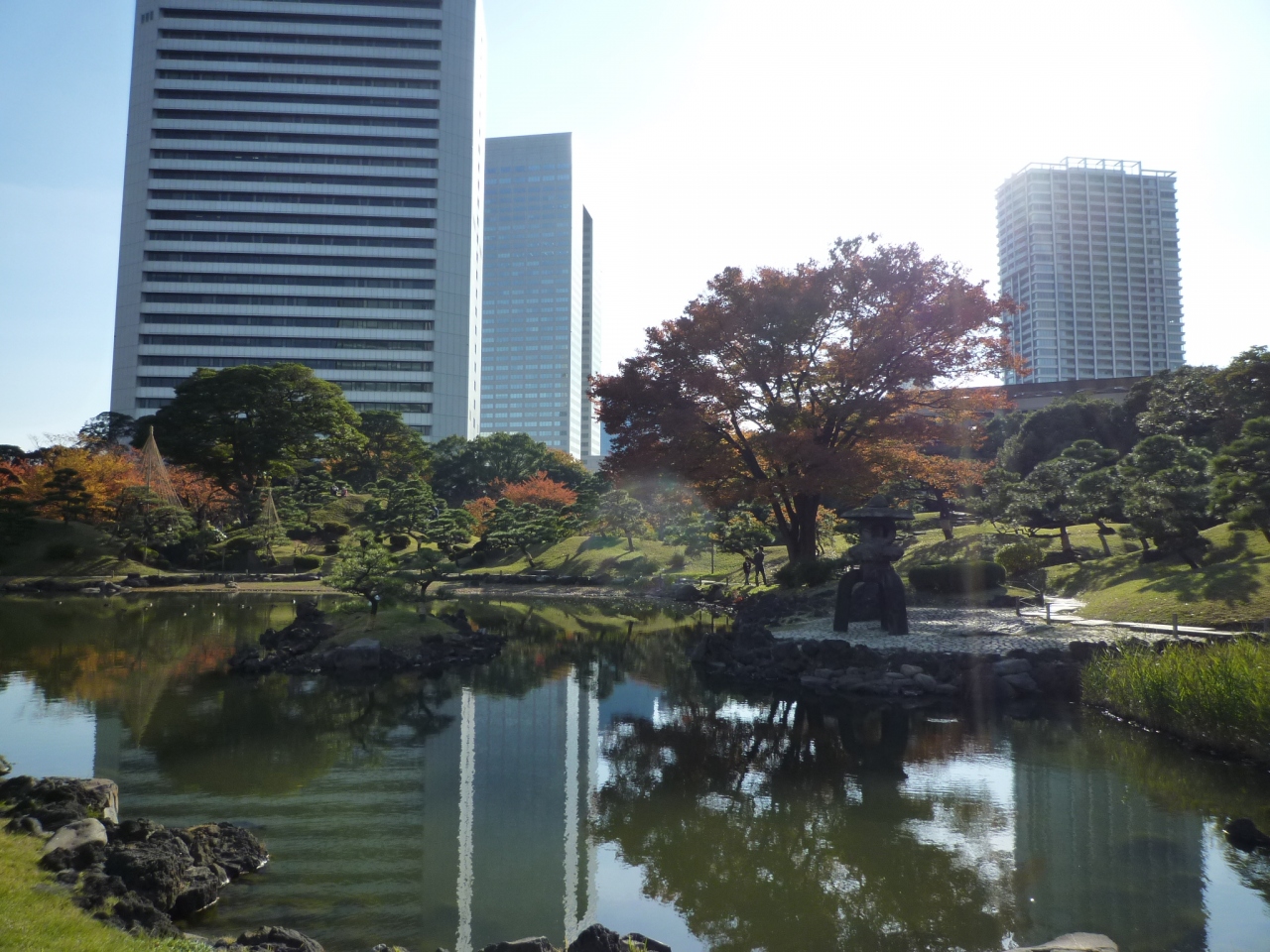 浜離宮と比べると規模ははるかに小さいですが、このくらいの広さの方が散策には適していると思います。庭園中央は大きな池になっており、秋には周りを紅葉が囲み、都心に居ながら自然に触れることができます。
