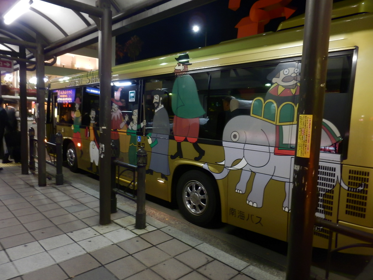 南海の堺駅と堺東駅を結ぶバスです。車体はゴールドで、ザビエルさんや南蛮人の絵が描かれているので目立ちます。本数が多いので、2つの駅間を移動するのは便利です。堺駅側の乗り場は駅の目の前ですが、堺東駅の乗り場は高島屋前なので注意が必要です。