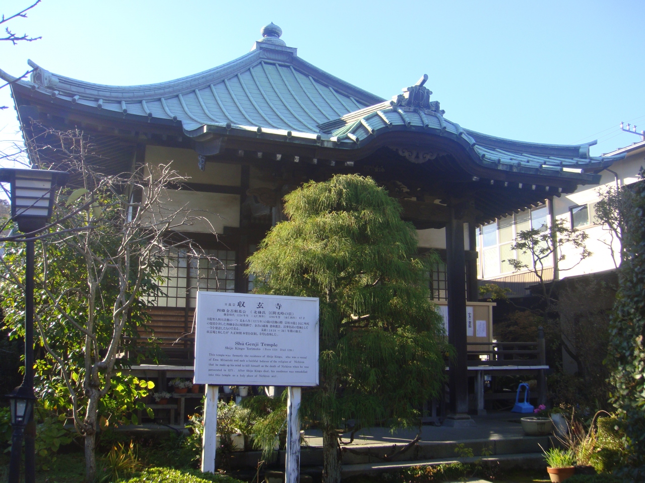 江ノ電長谷駅から大仏方面へ歩くと、左側に鎌倉時代の武士四条頼基の邸宅跡に創建された収玄庵に始まるとされる小さなお寺「収玄寺」があります。境内に東郷平八郎の揮毫による「四条金吾邸址」の石碑がありますが、観光客はほとんどいませんでした。