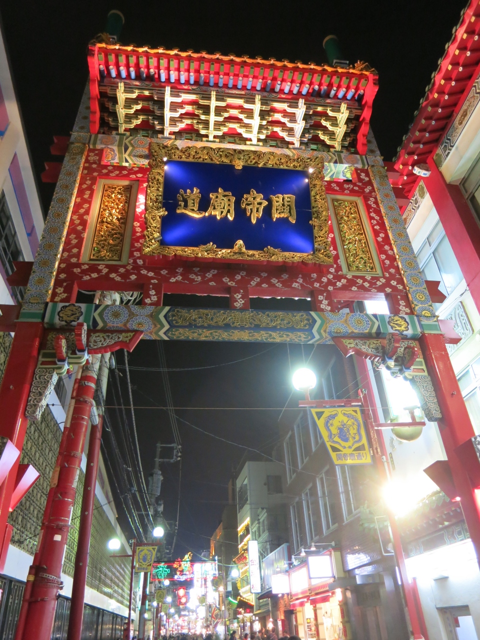 横浜中華街の関帝廟通りの西の入口にある門です。地のとこしえ(永遠)を意味するとのこと。関帝廟側から見て、表に「地久門」裏に「関帝廟通」と掲げられています。この門の周辺は大通りよりは人通りが少なく、リーズナブルな中華店が多いです。