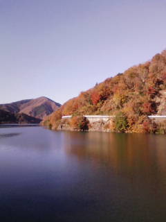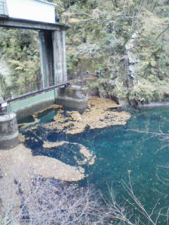 新松田から西丹沢自然教室行きのバスに乗り、丹沢湖湖畔の玄倉(くろくら)で降りる。玄倉川に沿って、歩いて行くと、ユーシンブルーのすきとおる玄倉ダムが待っていた。紅葉は終わり落ち葉がダムに浮いていたのは残念だったが、十分にきれいだった。