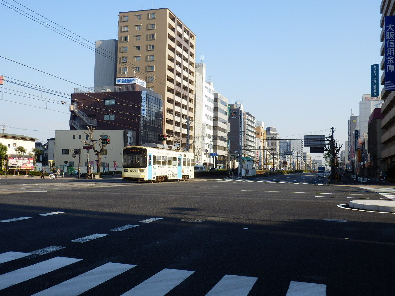 堺では、南海の堺駅と堺東駅のちょうど中間にある大通りを走っていました。路面電車の線路の両側は緑化されていました。電車は頻繁にやってくるので時刻表をチェックする必要はありません。電車の車体はカラフルで、全面広告になっているものもいくつか見かけました。